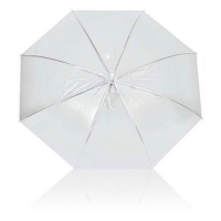 Paraguas de 8 paneles en variada gama de vivos colores transparentes. De 105cm de diámetro, con apertura automática y en resistente material POE. Con varillas metálicas en color plateado, cierre de corchete y suave mango en color gris plateado.
