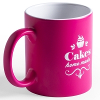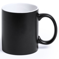 Taza de cerámica de alta calidad de 350ml de capacidad. Parte exterior en vivos colores, especialmente diseñada para marcaje en láser, e interior en color blanco. Al grabar el logotipo en la parte exterior, se muestra el color del interior de la taza. Presentada en caja individual.