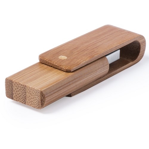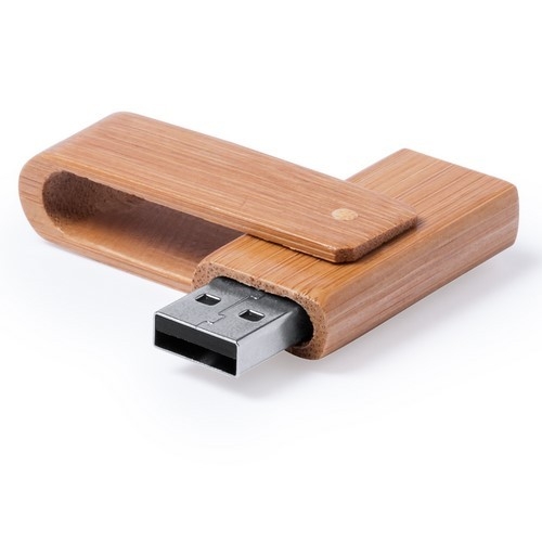 Memoria USB de 8GB de capacidad, con mecanismo giratorio y acabado en suave madera de bambú. Presentada en estuche individual de cartón reciclado.