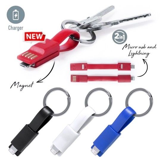 Cargador llavero USB en variada gama de vivos colores. Con conexión dual micro USB/lightning. Presentado en bolsa individual.