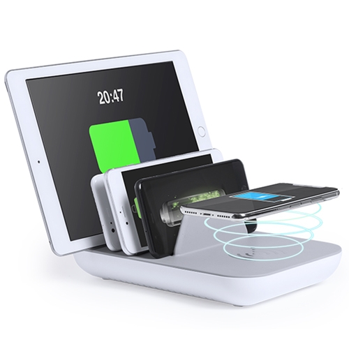 Estación de carga con tecnología dual de carga inalámbrica y por cable. Incorpora base de carga inalámbrica, salida de carga con conexión de entrada y salida de corriente tipo C y triple salida USB. Con 10.000 mAh de capacidad de carga para alimentar simultáneamente hasta 5 dispositivos móviles. Con superficie y base anti deslizantes. Incluye cable de carga para enchufe de pared y viene presentado en atractiva caja de diseño.