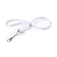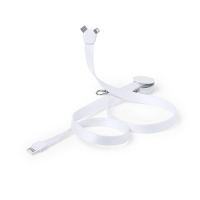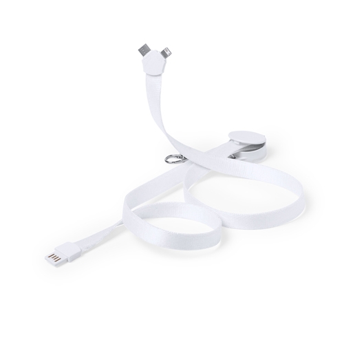 Lanyard cargador Tipo-C y con conexión dual micro USB/Lightning. Con ingeniosa carcasa central para los distintos tipos de conectores, especialmente diseñada para marcaje en tampografía. De 52cm de longitud, con accesorio mosquetón metálico y en resistente poliéster 300D de color blanco.