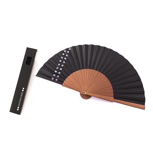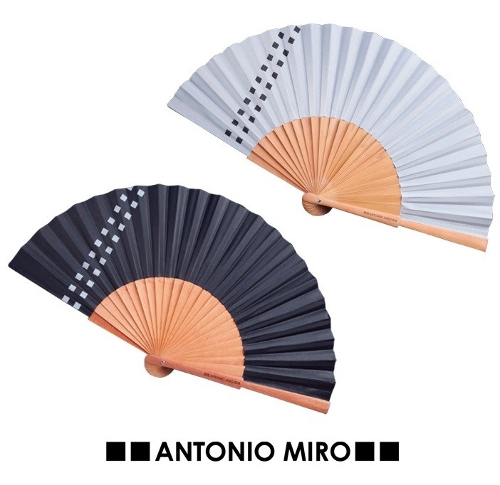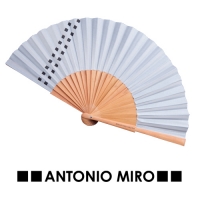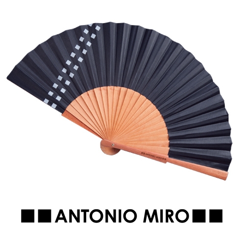Abanico de Antonio Miró con varillas en madera natural de peral pulido. Tela en sobrios colores con clásico diseño de la marca y logotipo en varilla. Presentado en caja individual.