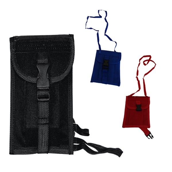 Portatodo en resistente poliéster 600D y variados colores. Solapa de cierre de clic con bolsillo de cremallera a juego, dos bolsillos interiores y cinta de transporte a juego.