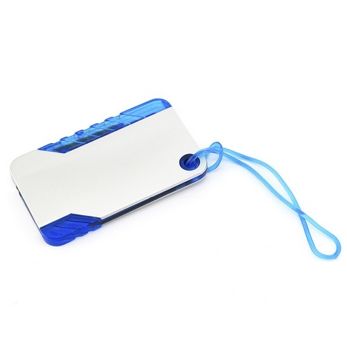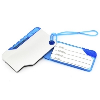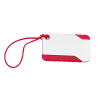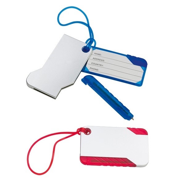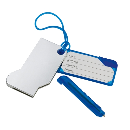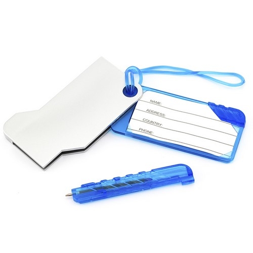 Identificador de maletas en original diseño bicolor. Con resistente tira de silicona y minibolígrafo -de tinta azul- a juego incluido.