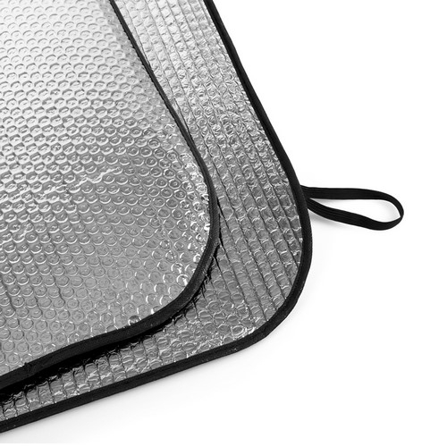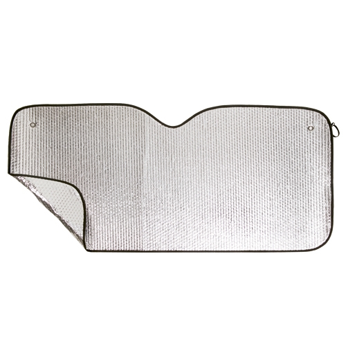 Parasol en aluminio con burbuja en ambas caras en color plateado de acabado metalizado con ribetes en color negro. De tamaño 130x60cm, con argollas metálicas de refuerzo, cintas elásticas para plegado, dos ventosas para ajuste en luna y presentación desplegado en plancha para fácil impresión.