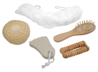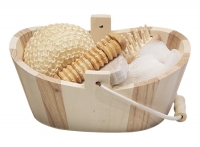Canasto SPA de belleza en madera modelo "Naturals". Contiene cepillo de pelo, esponja malla, masajeador de madera, piedra pomez y esponja de masaje corporal.