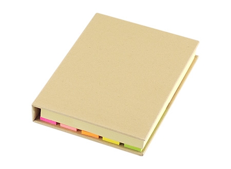 Memo set Ecológico con Tapa Dura de Cartón natural. Incluye 100 notas adhesivas amarillas grandes, 25 notas adhesivas amarillas medianas y 125 banderitas adhesivas de colores.