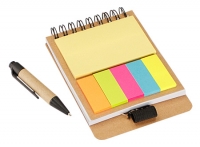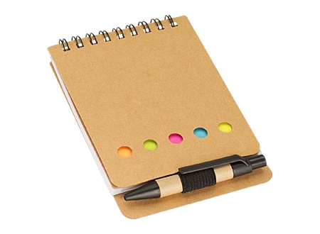 Memo Set Ecológico. Incluye 1 Bolígrafo Ecológico corto + 125 banderitas adhesivas de colores + 25 notas adhesivas rectangulares + Block de Notas con 60 hojas blancas lineadas. Terminación Espiral Doble Cero Metálico.