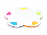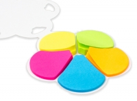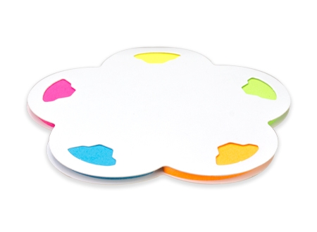 Memo set Ecológico con tapa y contra-tapa de cartulina blanca reciclada. Incluye 150 banderitas adhesivas de colores con forma de pétalo de flor.