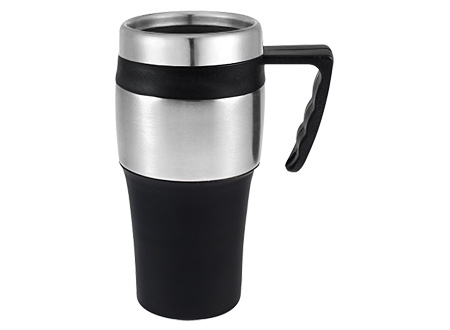 Mug térmico de doble pared aislante con tapa rosca de acero inoxidable y dosificador. Interior de PVC negro y exterior de PVC negro y acero inoxidable.