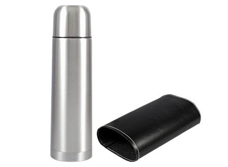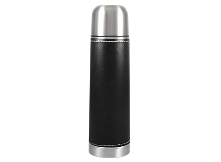Termo de Acero Inoxidable de 1/2 Litro, con funda de PU negro (removible). IMPORTANTE Termo para líquidos calientes o fríos. No llenar con lácteos o bebidas gaseosas.