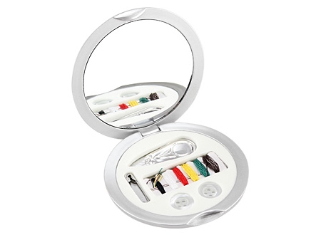 Set de Costura plateado redondo con espejo. Presentación en caja plateada de cartón.