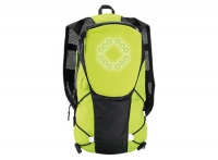 Práctica mochila deportiva con señales LED para ciclistas y deportistas en general. 4 señales LED: Adelante, Derecha, Izquierda (luces verdes) y Detención (luces rojas). Con control remoto inalámbrico instalable en el manillar de la bicicleta. Panel de señales desmontable y recargable con cable USB.