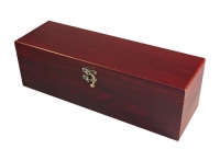 Caja de madera barnizada con 4 accesorios metálicos de vino con finas terminaciones de madera. Elegante cuna satinada negra para botella.