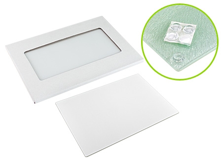 Tabla de Cocina para cortar alimentos, en vidrio texturado para Sublimación. Presentación en caja de cartón blanco.