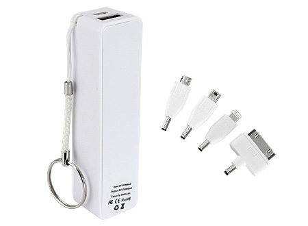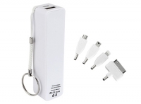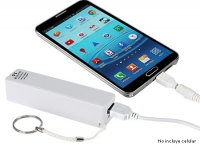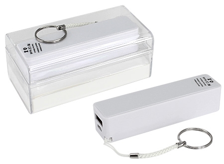 Llavero-Power Bank cargador USB portátil plástico. Capacidad 2000mAh. Incluye cable USB + 4 adaptadores para compatibilidad iPhone 5 & 6, Samsung Galaxy, mini-USB, etc. Batería recargable incorporada. Presentación en caja de regalo de acrílico transparente.