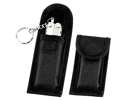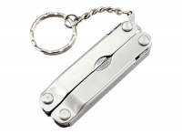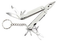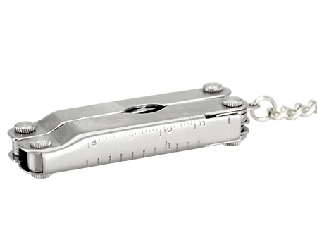 Multiherramienta metálica plegable de 10 funciones, con llavero. Incluye mini-regla en cm y pulgadas. Presentación en estuche de polyester negro y caja plateada de regalo