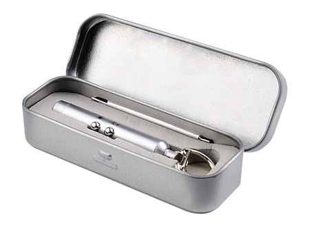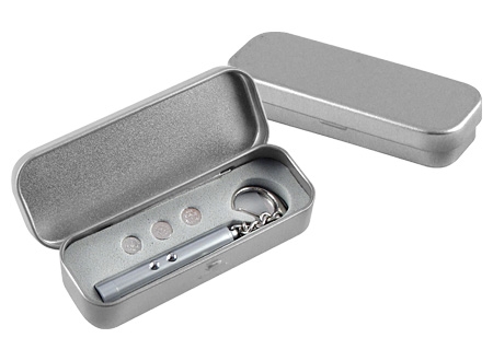Tamaño: Ø 1.6 x 6.5 cm. Colores: Plata (00). Sugerencia de Impresión: Serigrafía, Pantografía. Pilas: Usa 3 pilas botón (incluidas). Detalles: Área Imprimible 1.5 x 4 cm.