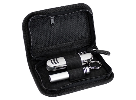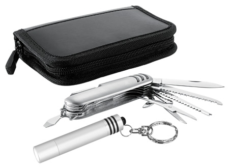 Set de Supervivencia "XD", incluye Cortapluma 12 funciones + Llavero-Linterna LED metálica de 9 cm + 3 pilas botón tipo AG3, presentación en elegante Estuche Negro con Gris.