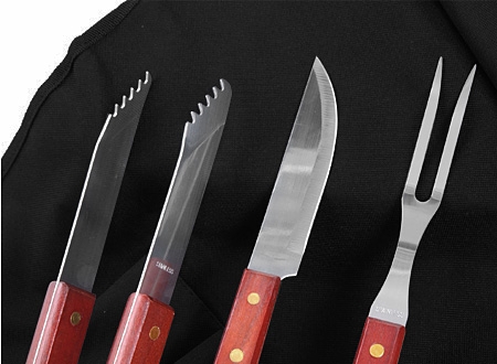 Delantal de tela raquelada negra con 3 prácticas herramientas para asado. Plegable y transformable en bolso. Fácil para bordar o imprimir.