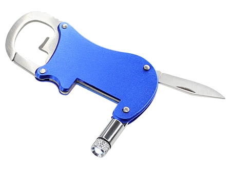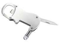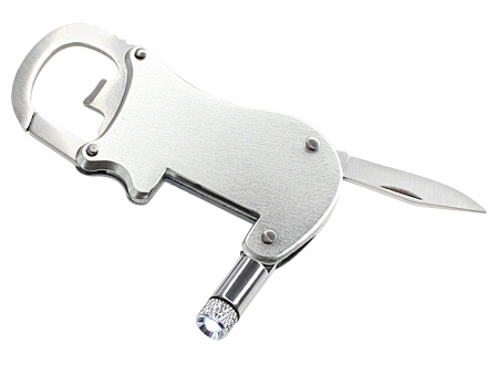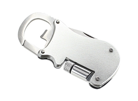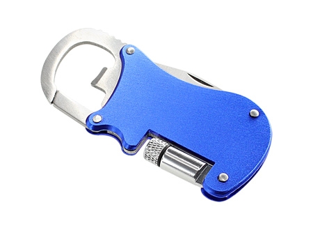 Multiherramienta metálica 4-en-1 con Linterna LED, Navaja, Destapador y Mosquetón.