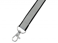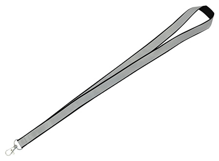 Lanyard Reflectante Plateado. Reverso polyester negro de 2 cm de ancho, con terminación mosquetón metálico.