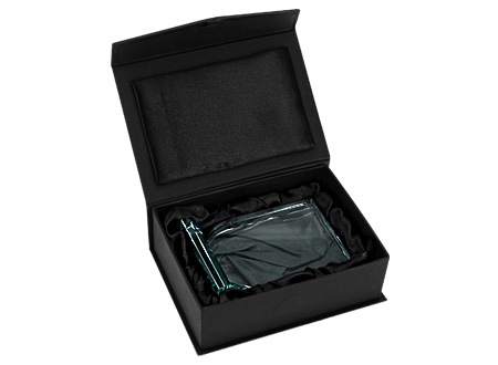 Tamaño: Trofeo 6 x 9 x 3 cm / Caja 12.5 x 9.4 x 4.3 cm. Sugerencia de Impresión: Grabado Láser. Presentación: En caja de cartón forrado con cuna aterciopelada negra. Material: Cristal-Jade.