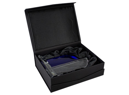 Deluxe Trofeo grande de Cristal modelo "Catedral" con aplicación de cristal-color. Presentación en caja de cartón forrado negro.