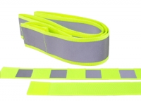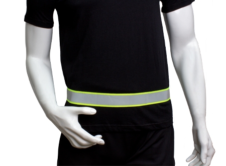 Banda (cinta) elástica reflectante para hombro y cintura, con 5 ajustes de velcro. Se puede usar como banda presidencial o como cinturón. Viene en práctica bolsa de polipropileno con orificio para colgar en ganchera.