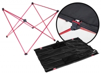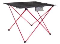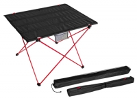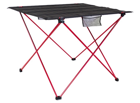 Mesita plegable de Picnic. Estructura base plegable y desarmable de aluminio color rojo, cubierta plegable en tela Oxford 600D color negro. Incluye 2 bolsillos de malla para accesorios. Ideal para llevar de picnic o a actividades al aire libre. Es muy liviana, pesa sólo 1 kg. y como es plegable y desarmable, ocupa muy poco espacio, se guarda dentro de un bolsito (incluido) de sólo 100 x 12.7cm