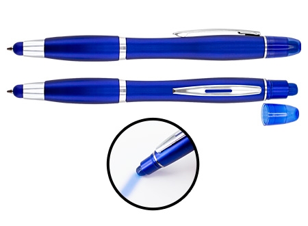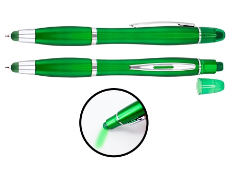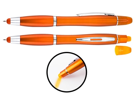 Bolígrafo plástico con cuerpo de color y puntero screen-touch al tono. Incluye práctico destacador (resaltador) de cera de color. Escritura azul.