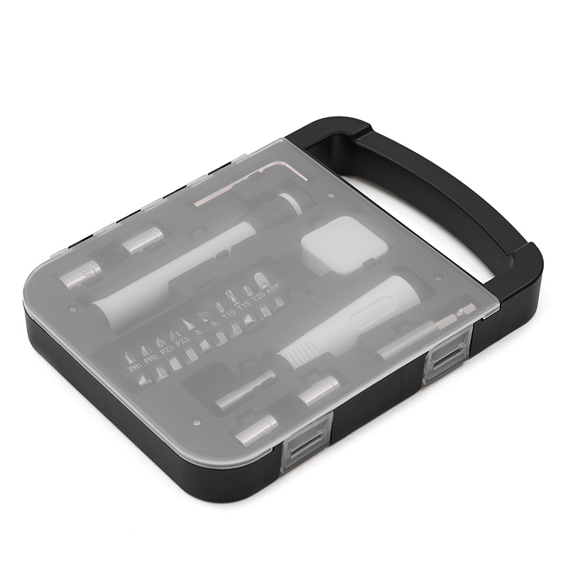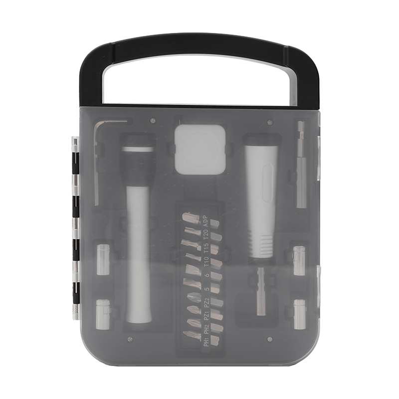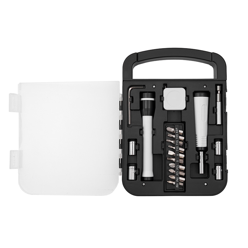 Set de herramientas, con en maletin de tapa transparente. Incluye: Llave allen, linterna, metro extensible, destornillador de puntas intercambiables. Medidas: 22 x 16 x 2,7 cm. Tahg