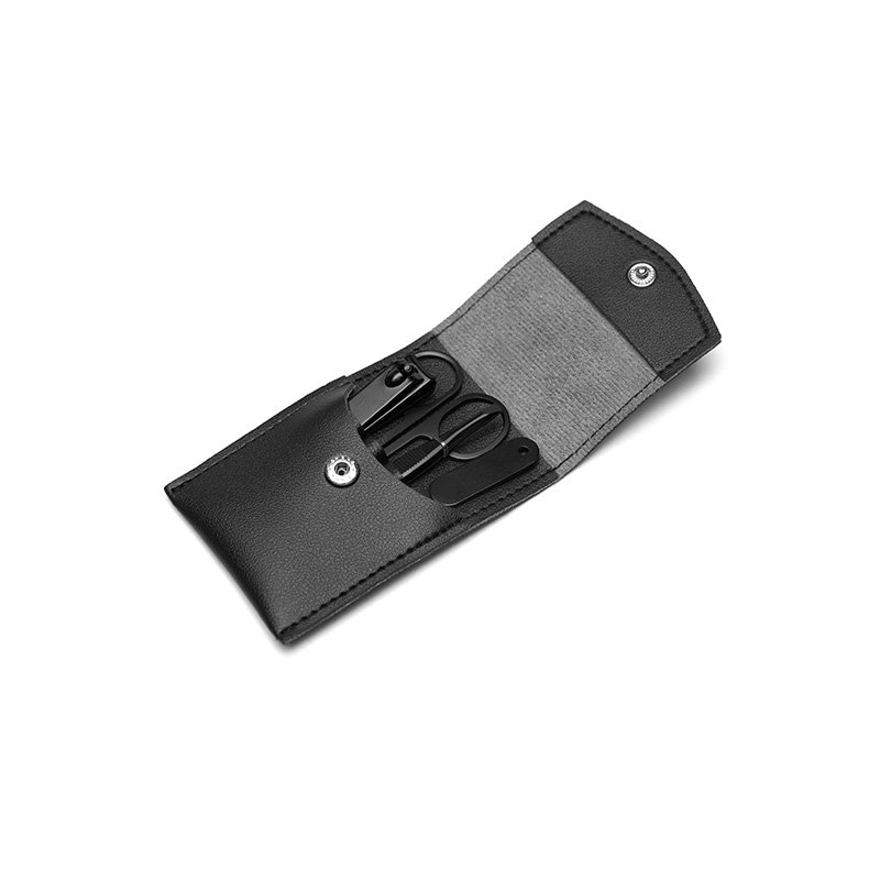 Set de belleza, incluye tijera, cortauñas, pinza de depilar y lima, todos en acero inoxidable color negro. El estuche está confeccionado en cuero PU negro. Medidas:10 x 7 x1.5cm. Tahg