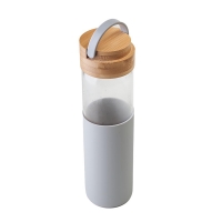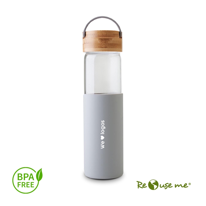Botella reutilizable de vidrio, con tapa de bamboo y funda de silicona. Cuenta con un agarre en su tapa para su transporte. Producto libre de BPA. Medidas: 22,6 cm x Diámetro 6,8 cm. Capacidad: 550ml. ReUseMe. LOGO24: Producto disponible para el servicio de logueo en 24 horas respetando unidades mínimas de logueo y 200 unidades máximas. Consultar términos y condiciones del servicio