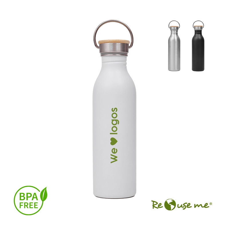 Sport Bottle reutilizable de acero inoxidable AISI 304, con tapa rosca de bambú y gancho de agarre. Producto libre de BPA. Medidas: 25 cm x diámetro 7 cm. Capacidad: 700 ml. ReUseMe. LOGO24: Producto disponible para el servicio de logueo en 24 horas respetando unidades mínimas de logueo y 200 unidades máximas. Consultar términos y condiciones del servicio