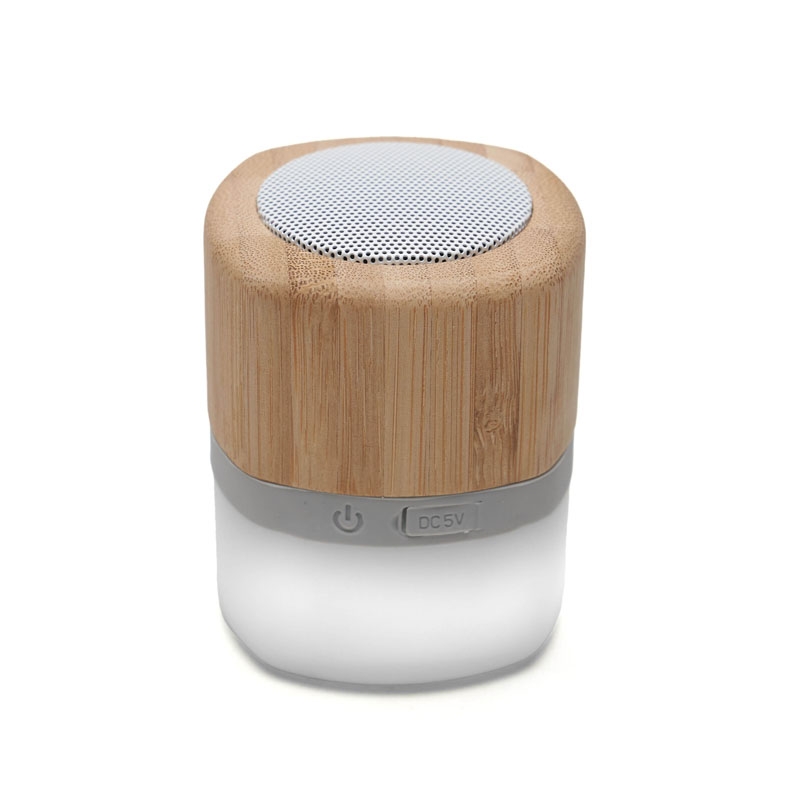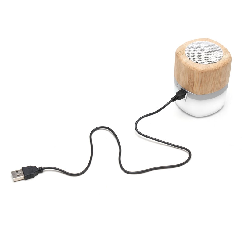 Parlante portátil con tecnología Bluetooth. Realizado en combinación de ABS con Silicona y bamboo, con iluminación en la base. Características técnicas: Batería de 300mAh | Poder del parlante: 3W | Frecuencia: 200Hz-20KHz | Conexión: 5V / 500mA | Distancia de alcance: 10 Metros | Peso 150gr | Medidas: 6 x 6 x 7,5 cm. ReUseMe